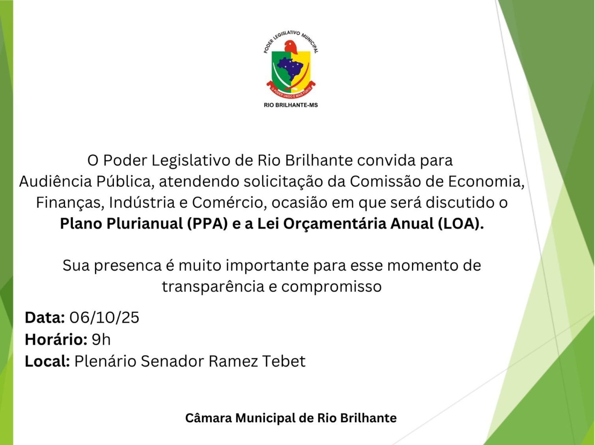 A Câmara Municipal de Rio Brilhante, em parceria com o Executivo Municipal, realizará na próxima segunda-feira, 6 de outubro, às 9h da manhã, uma audiência pública destinada à apresentação e discussão de dois importantes projetos de lei que tramitam atualmente na Casa Legislativa.