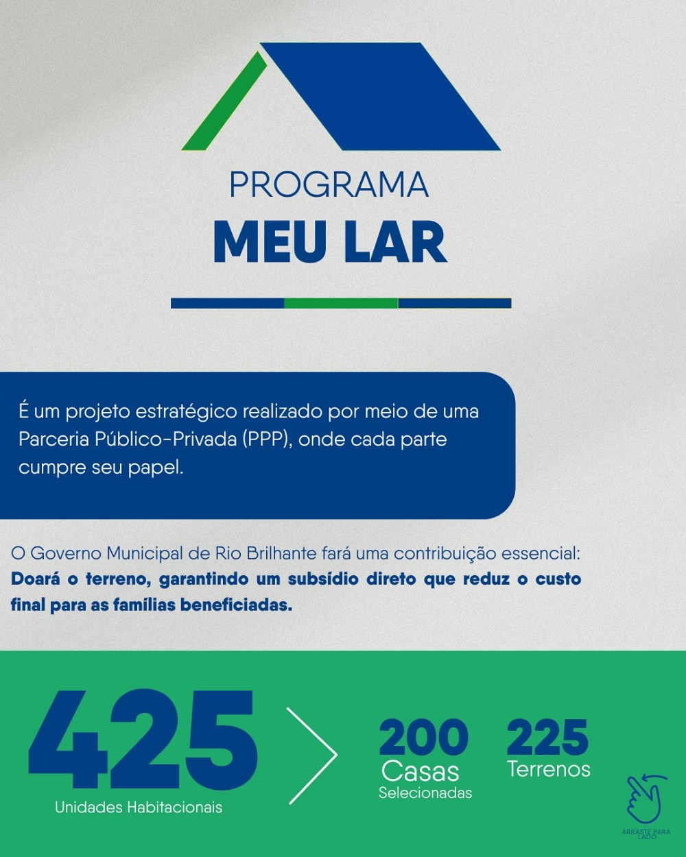 A Câmara Municipal de Rio Brilhante desempenhou papel fundamental para viabilizar um dos mais importantes programas habitacionais do município. Foi aprovado o Projeto de Lei do Executivo Municipal que autoriza a realização de sorteio e celebração de contratos de doação de lotes urbanos de propriedade do Município. A tramitação na Casa de Leis atendeu a urgência do Executivo e a necessidade da execução deste projeto de tamanha importância que beneficiará famílias de baixa renda. Com isso, o município deu início ao processo de inscrições para o cadastro de reserva, que deverá beneficiar com terrenos, inicialmente, 100 famílias na primeira etapa; 125 na segunda etapa e posteriormente, serão cerca de 200 casas.