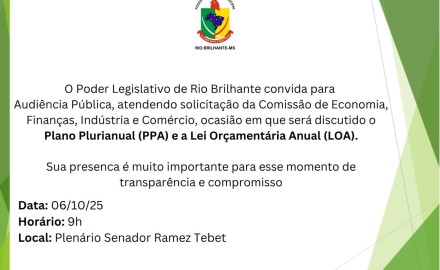 A Câmara Municipal de Rio Brilhante, em parceria com o Executivo Municipal, realizará na próxima segunda-feira, 6 de outubro, às 9h da manhã, uma audiência pública destinada à apresentação e discussão de dois importantes projetos de lei que tramitam atualmente na Casa Legislativa.