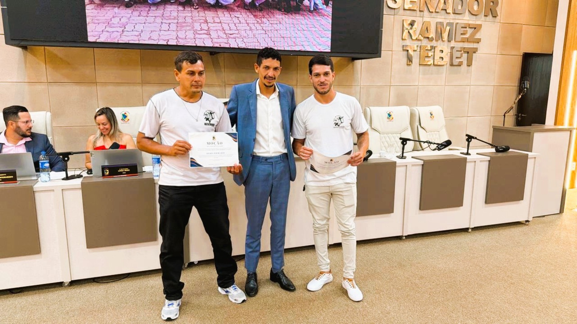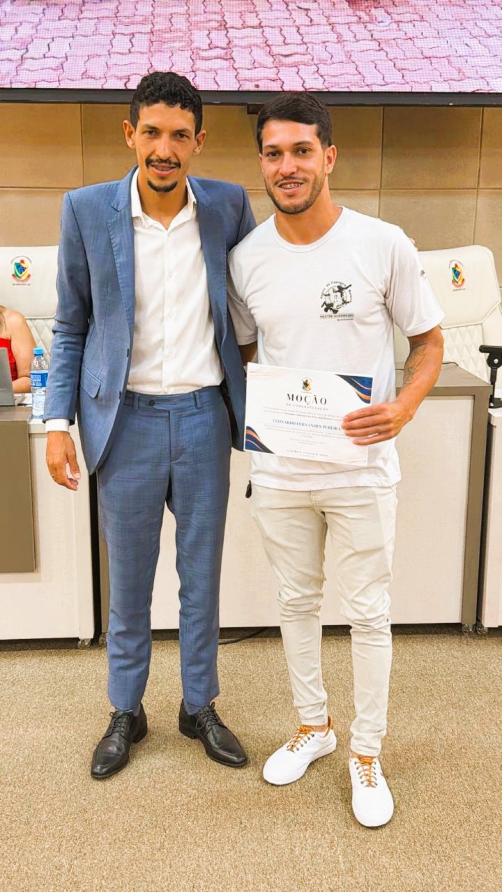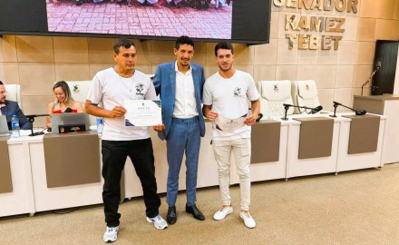 Na Sessão Ordinária desta segunda-feira, dia 2, o vereador Jeferson da Silva dos Santos, o Jefinho, homenageou com uma Moção de Aplauso o professor Leonardo Fernandes Pereira e o capoeirista Gelson Pereira Ruis, da Escolinha de Capoeira da FUNCERB, em reconhecimento aos relevantes serviços prestados à cultura, à educação e ao desenvolvimento social de Rio Brilhante.